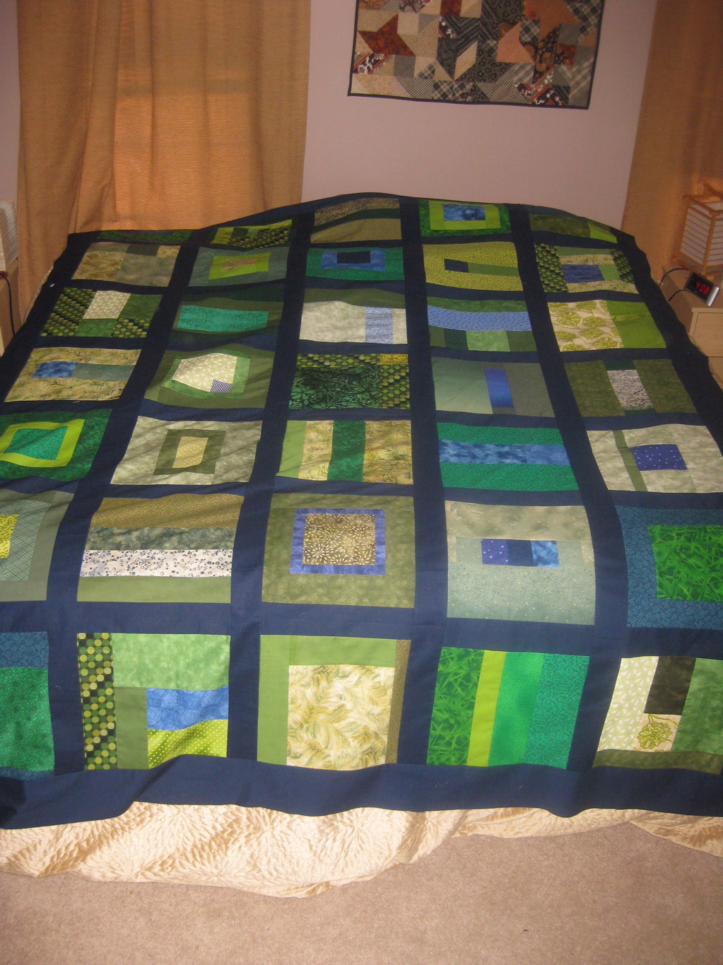 We asked all of our friends who sew to donate a green or blue fabric scrap for us to incorporate. Then we went to work assembling linear, modern, scrappy blocks. It’s 5 x 7 blocks that were cut to 12 inches (so 11.5 inches squared after assembly). A monster! But isn’t it fun?