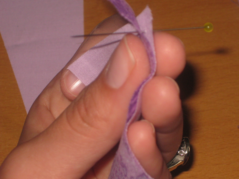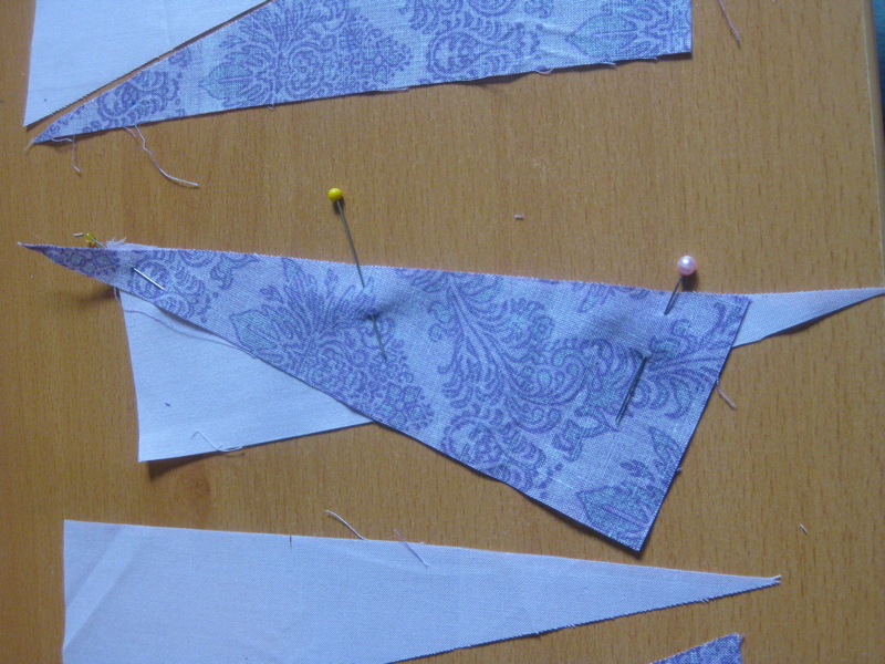 6. Pin the triangles together, keeping a pin in that marked spot, and aligning the long edges together to the best of your abilities:
