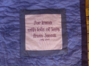 This was my first time stippling, and I couldn’t have chosen a more challenging time to try this technique. For one, as you know if you’ve been reading, my pedal is broken. I can still use it, but it explodes whenever I release pressure, and I sort of have to smash it in order to get it to start. Needless to say the speed control is problematic. (And I just realized that the replacement pedal I’ve ordered is lost in the shipping universe! Oy!). Also – my free-motion sewing foot is at my mom’s, so I had to try and do this with a normal pressing foot. It resulted in the threads getting caught in the fork of the foot about every 8 inches of sewing, which resulted in a lot of swearing. I also used this shiny rayon thread that was really pretty, and looks nice in the finished quilt, but it was a slippery snake to sew with!