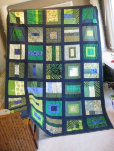 My friend came over yesterday to show me the finished product. She bound the quilt in a beautiful solid green and it just POPS! The blanket looks wonderful – and BOY is it big.