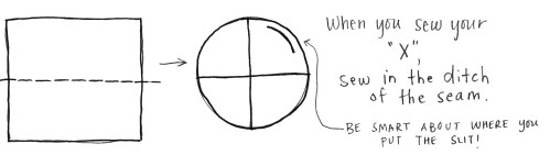 If you do this trick, you have to be super smart or at least sober. You’ve got a lot of things to keep track of (dangling modifierSssszzz). You have to be sure that you put your slit in a smart place so that the seam of the patched together fabric can be one of the arms of the X. Makey sense?
