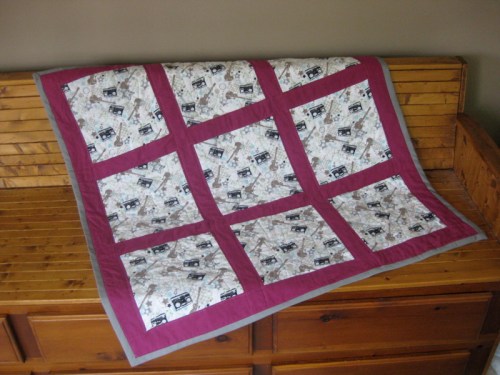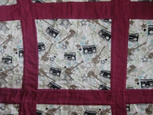 It’s a super fun guitar and boom box flannel pattern.  I learned a lot about quilting with this fabric.  I learned that you must must must pre-wash it because it super shrinks (good think I learned that before I started this baby).  I learned that it doesn’t care for a steam ironing, in that strips and squares will soon become ambiguous amoeba shapes.    (I really should work on pressing rather than ironing my quilt pieces regardless of fabric choice).