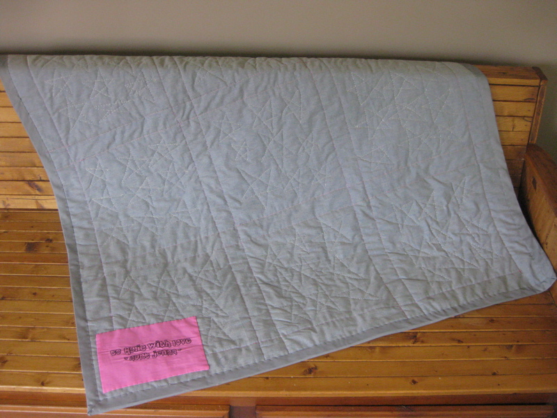 I quilted free-motion stars with a silver metallic thread, and bordered the sashing with a pink metallic.   Using these threads, I learned the importance of buying a proper metallic needle and using a bit of Sewer’s Aid on the spool.