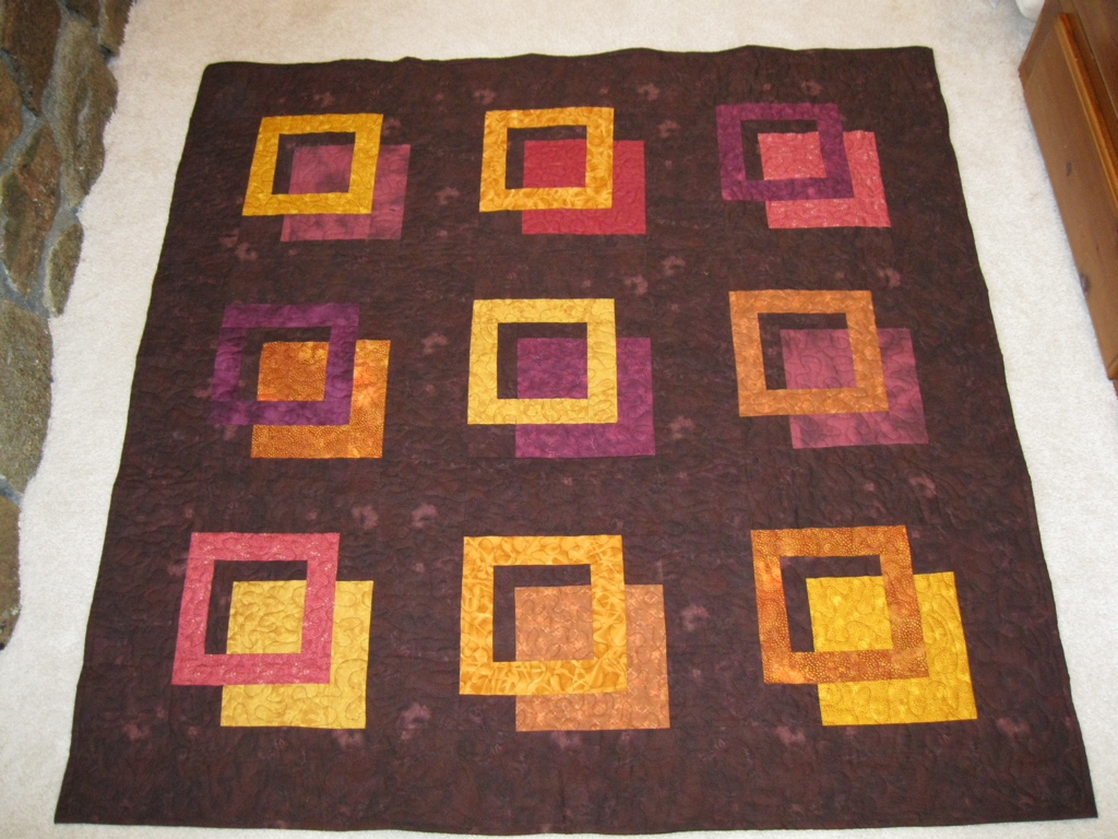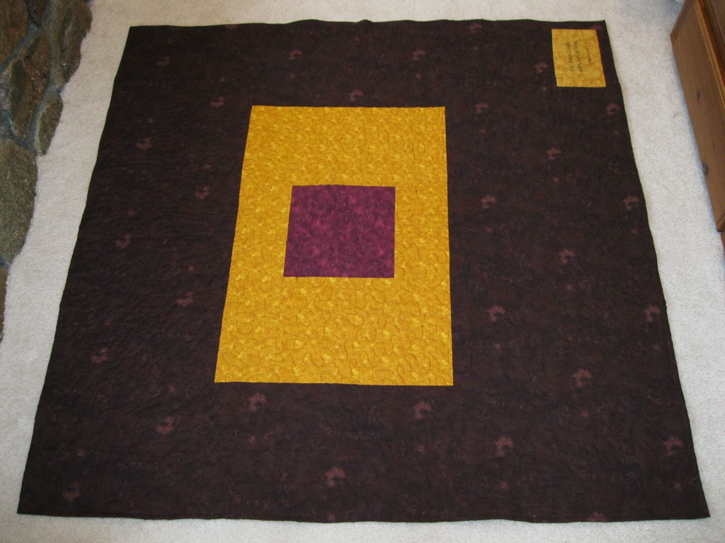 I hope Aunt Linda enjoys her present, and that you all like it, too! I’m pretty proud. Despite all of the errors, it all came out looking nice and I really like my color choices. I also am proud of the backing because not only did I design it myself, but I utilized fabrics I had on hand rather than going out and buying more.