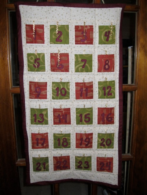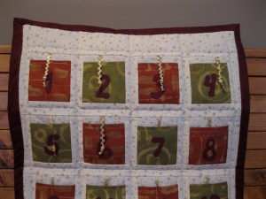 Each of the numbers are hand appliqued onto a pocket. I used a high quality felt so that I didn’t have to use any interfacing or machine stitching for the applique, and I wouldn’t have to worry about fraying. I also attached gold rick-rack weighted with gold beads to each pocket to use as a marker to check-off the days ’till Christmas. Someday I’ll fill the pockets with treats and maybe even nice notes directing the the recipient to perform a task in the spirit of the season, but my son’s a bit young for that now. It’s quilted with gold thread and the back has pockets to hold a dowel so that the calendar is able to hang.