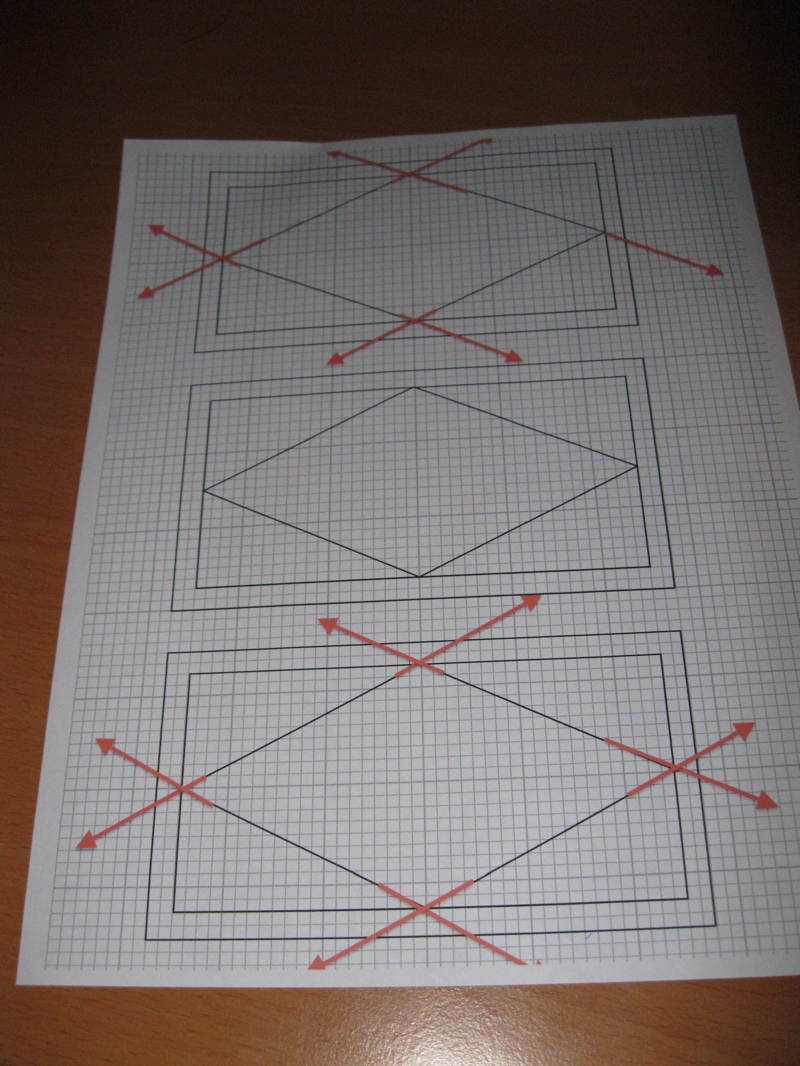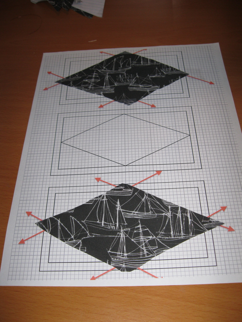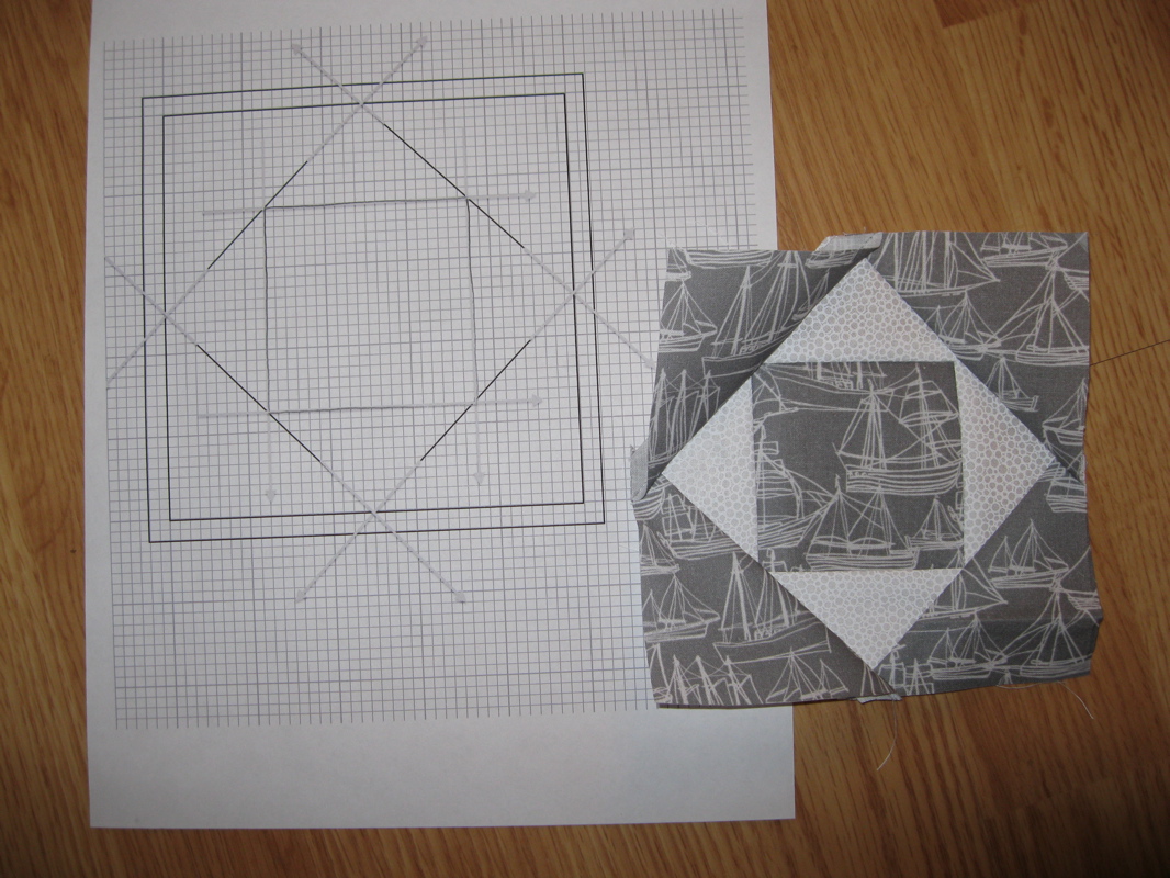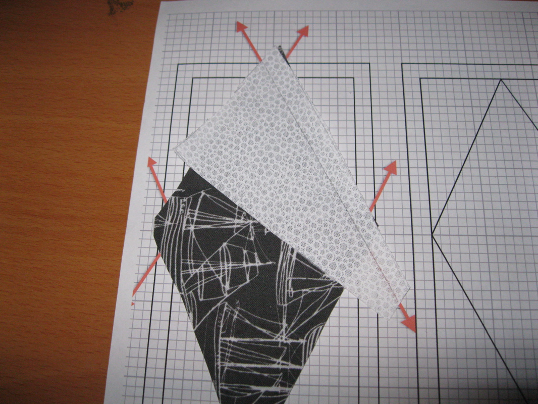 1. I had my husband design the patterns (he’s an engineer and it is a present from both of us, after all). The rectangle pattern is outlined showing the 1/4 of an inch seam allowance. That way, I knew my finished block would have to be at least that big in order to allow 1/4 of an inch seam allowance. The red arrows are extensions to my sewing lines.