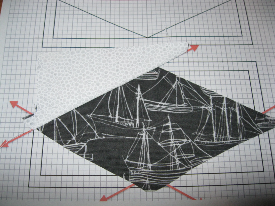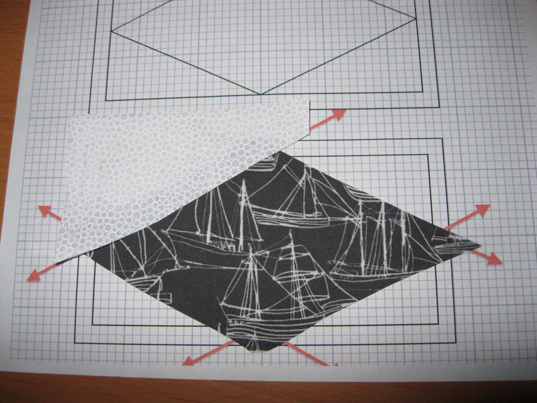 3. I placed my second fabric piece on the block, right-side up to ensure it would cover the whole area. (Sorry for the use of white fabric on white paper. I know it’s hard to see. You can click on the image to enlarge).