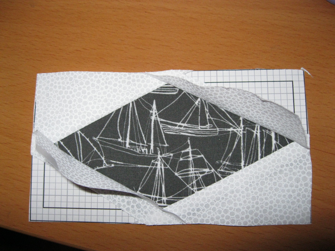 What’s a little bogus about those directions, and most paper-piecing directions I’ve read, is that it relies on your ability to see through the paper and any other fabrics you have already sewn. How are you supposed to be able to look through so many layers and know that the fabric piece is aligned correctly on top?