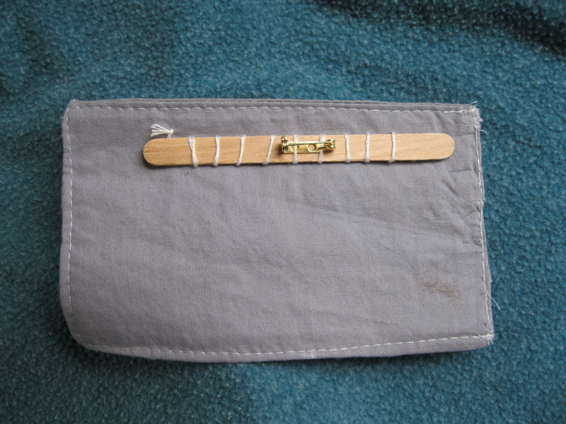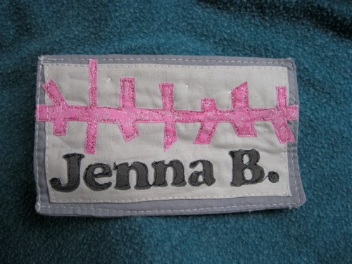 For the backing, I ironed on some interfacing to the back of another piece of dark gray fabric. Putting good sides together I sewed the front piece to the back, leaving a hole so I could turn it all inside-out. I turned it right-side out, pressed the raw edges under from my hole, and then top-stitched around the entire name-tag. For added stability I hand-sewed a popsicle stick to the back of the name tag after first applying a pin backing with super-glue to the stick. Fancy! I really like how it turned out, and it may have even warmed me up to the whole concept of raw-edged applique, as normally my obsessive need for finished edges drives my projects.