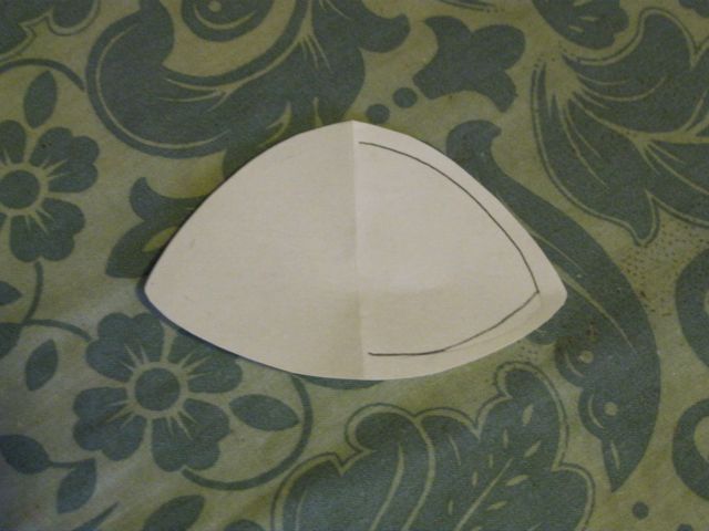 Now to make the base return to your pattern piece.  Fold the pattern from point-to-point.  Line the crease up on the folded edge of a piece of paper and cut out the shape of the small arch.   This is the pattern piece for the base of your eye.
