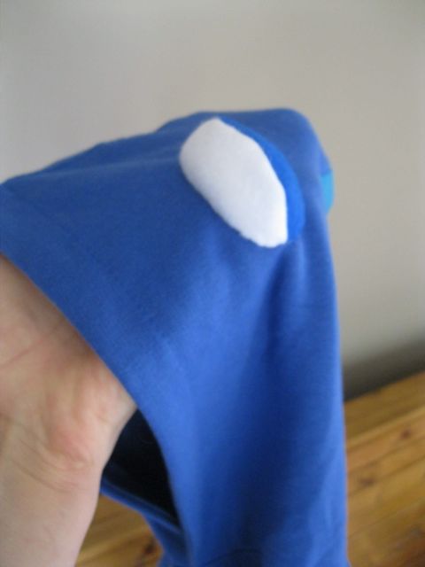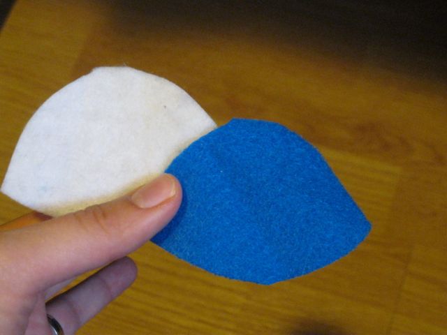 For each eye, cut out two of these shapes from fabric.  If you want your eye to be all white, use two pieces of white fabric.  If you want the back of the eye to match the hood of your costume, cut one from white, one from the color of the hood.