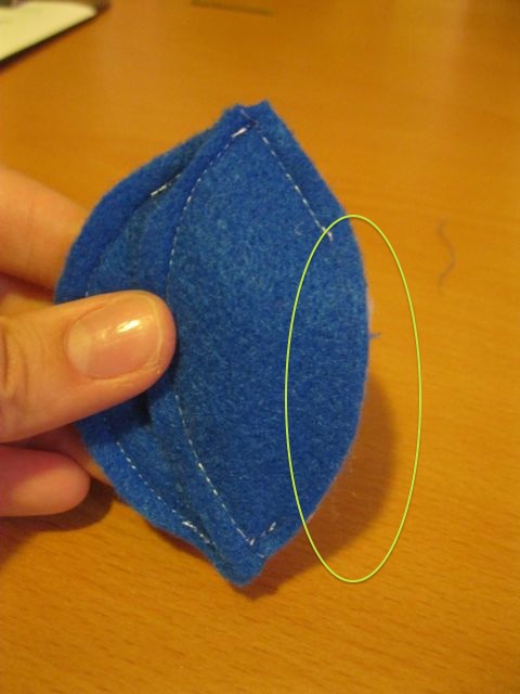 Turn the unit inside-out and fill with Poly-Fil.  Hand-stitch the gap closed and attach to the hood using your best blind-stitch.