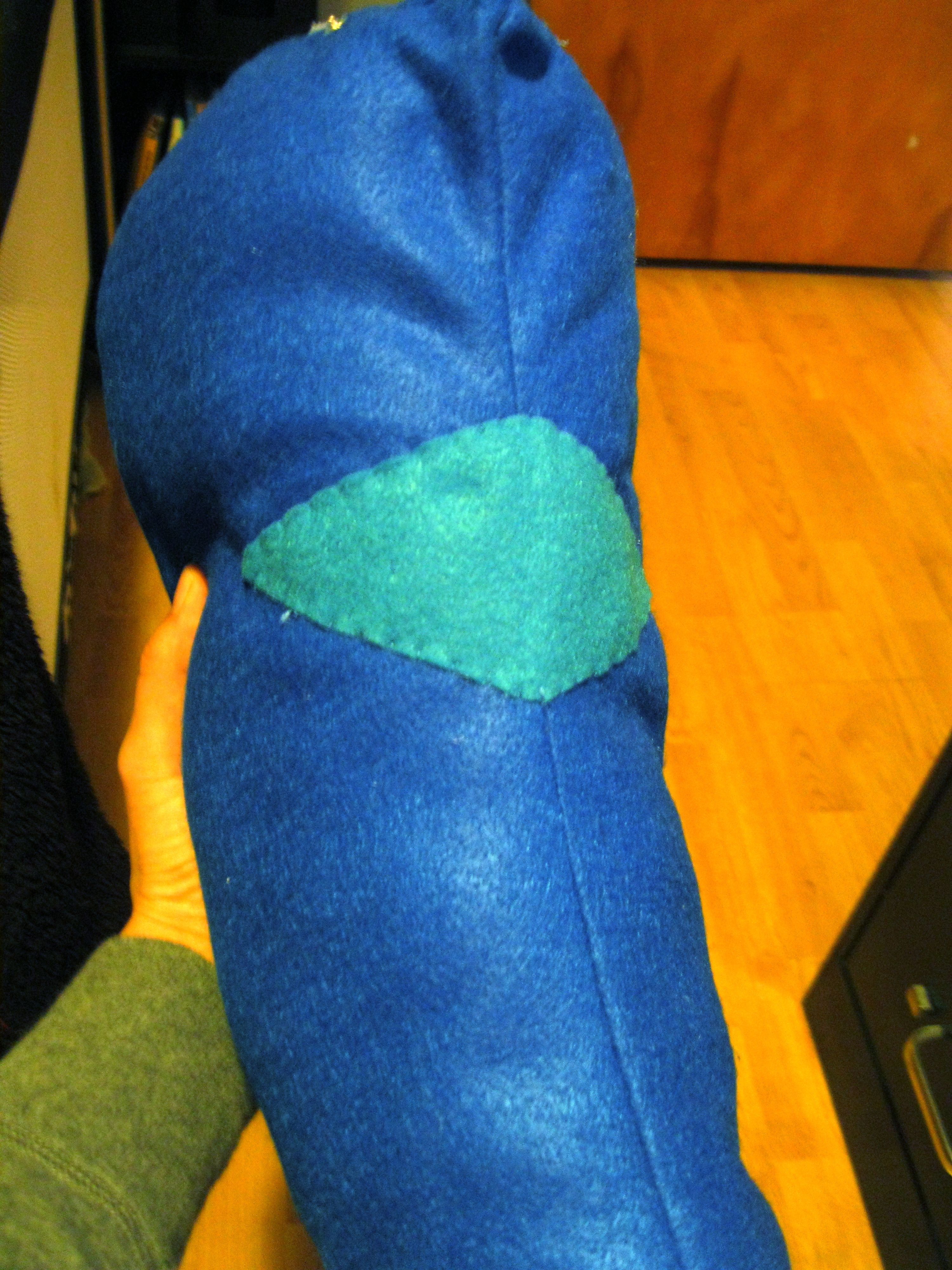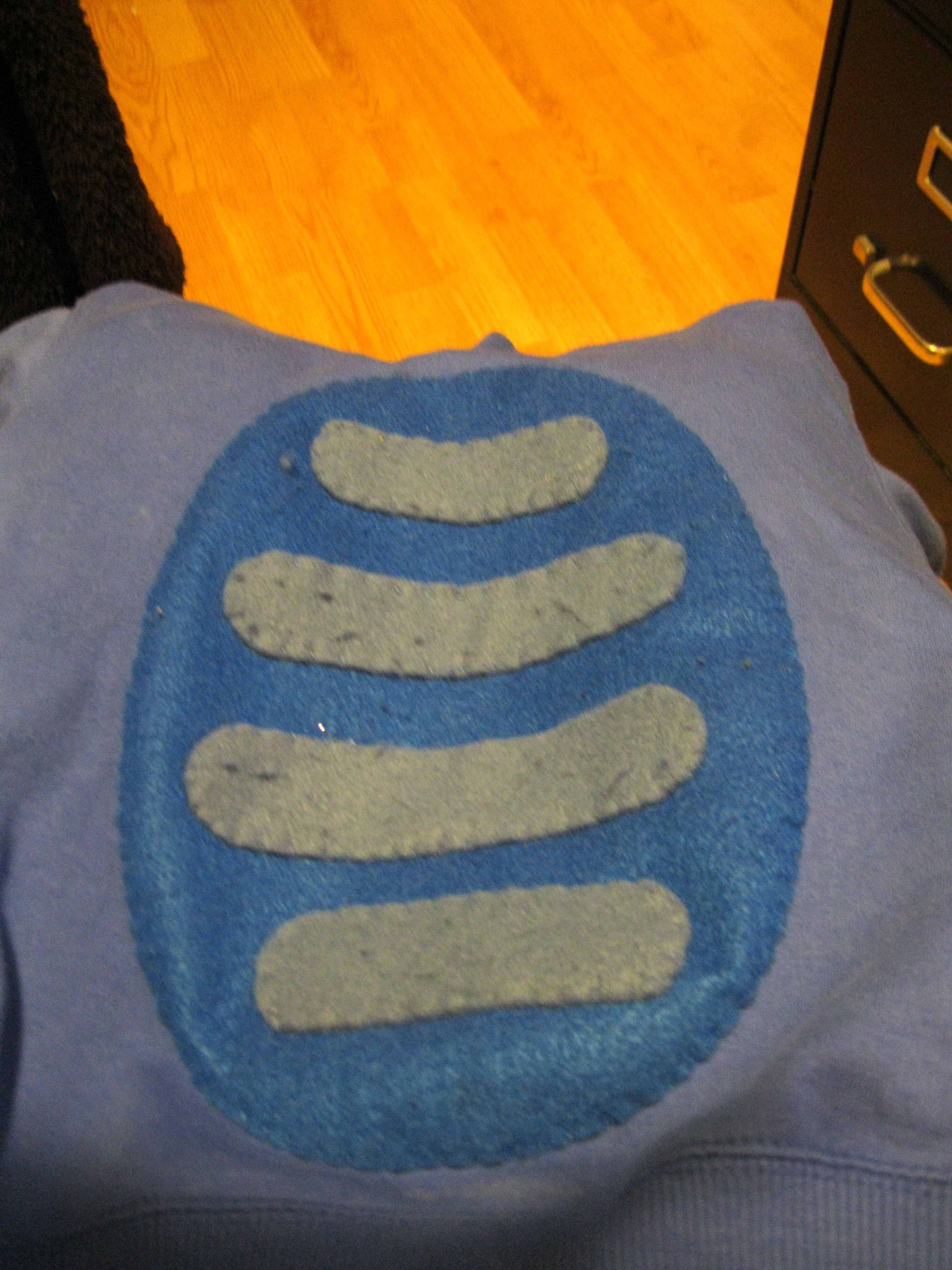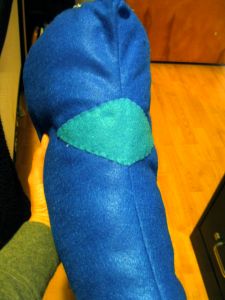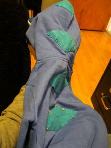 Turn your unit right-side-out, stuff with Poly-fil, and hand-stitch the gap closed. Now it’s time to figure out how you want to attach the tail to the sweatshirt. I chose a combination of Velcro, snaps, and buttons. I hand sewed the snaps and buttons into their respective places, and just placed some sticky Velcro onto the base of the tail, knowing it would stick to the felt in the costume.