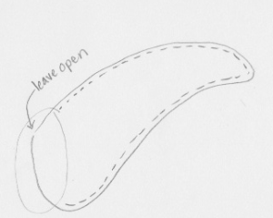 Okay here’s a big “fake it till you make it” part… to make the pattern for your base, puff up your tail unit and lay it open end-down onto your fabric. Trace a sshape that’s sort of like a triangle with curved sides, but a straight bottom. Cut it out! Sorry dudes – this isn’t “how to be perfect,” it’s “how to be Jenna.”