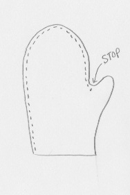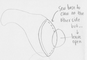 Flip your claw right-side out through the gap, stuff with Poly-fil and then hand-stitch the gap closed, tucking in the seam allowance. Hand-stitch to your mittens and claws!