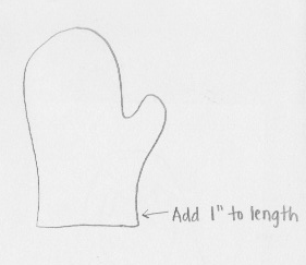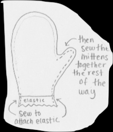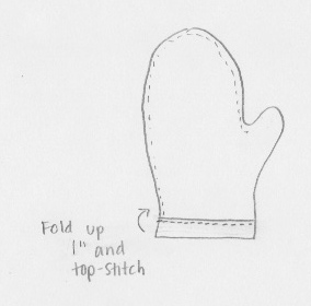 Cut some elastic about 1 1/4 inch longer than your costume wearer's wrist measurement and slide it into the tube you created by folding the cuff up. I find it helps to sew one end into place, and then have a safety pin attached the other end to ease it sliding through the tube. Once it comes out the other end, baste stitch it into place. Then sew the rest of the mitten unit together from thumb crease, over the elastic, to the cuff.