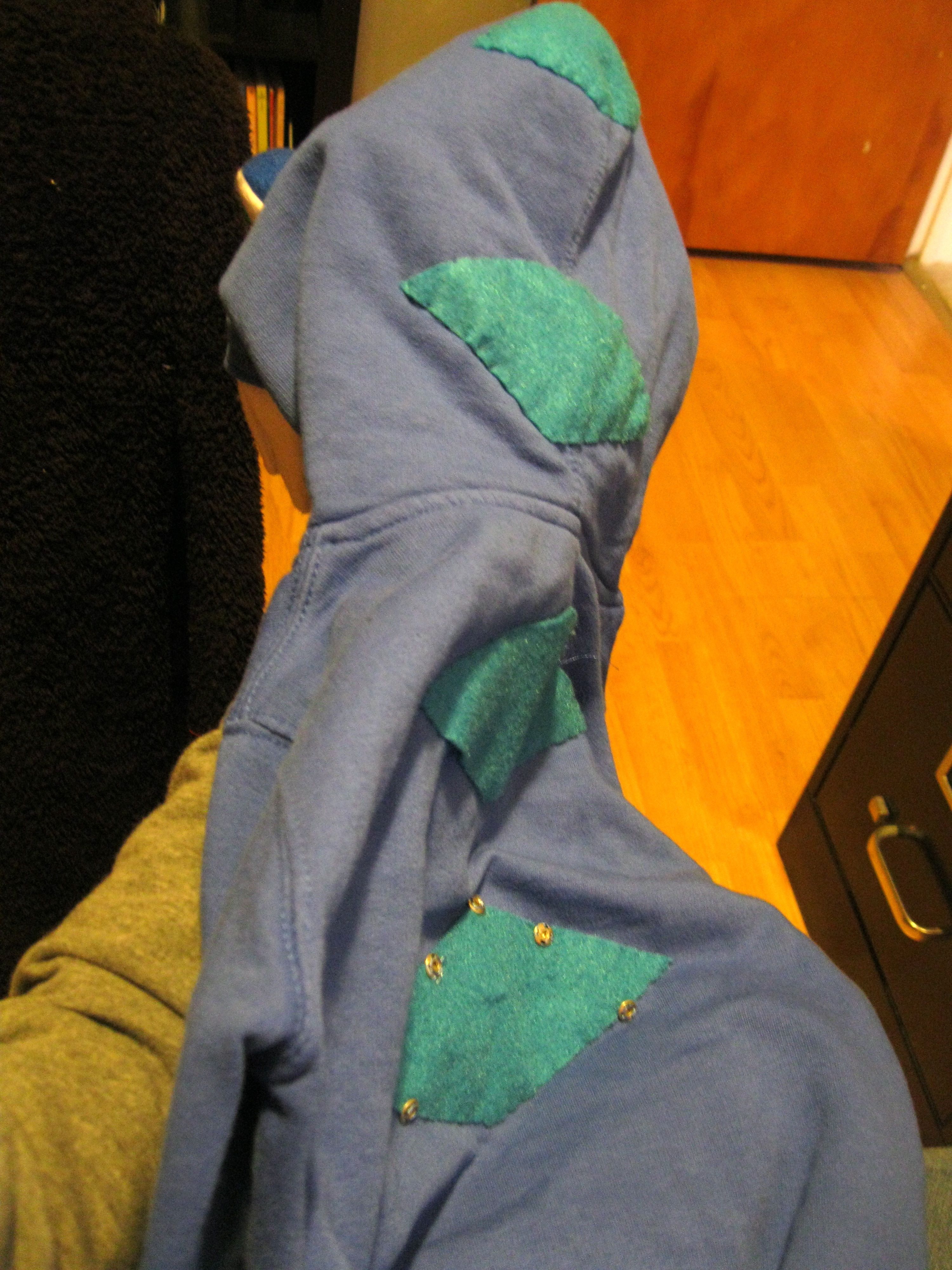 The tail is the trickiest part of this costume. I wanted the tail to be removable because otherwise my kiddo couldn’t wear the costume in the car. Also, it can be a bit cumbersome to walk around with the tail, so I wanted to be able to offer him a break from being a big-long-tail-wearer. So there is a great deal of “fake-it-until-you-make-it” when it comes to your methodology for attaching the tail to the hoodie and also for constructing the base of the tail… I’ll explain as best as I can as we go.