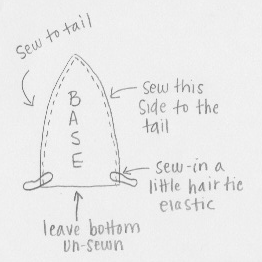 Sew the base to the tail unit one side at a time. Do not sew the tail to the long-stripped base unit as we need that gap to turn this sucker inside out. If you feel like you're going to want to use buttons to attach the base to the sweatshirt, trap some elastic loops inside the unit so that when you flip it right-side-out, you'll have two little hoops to attach to buttons.