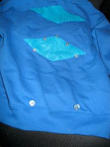 Really I guess they’re diamonds rather than stripes… Cut them out of felt and hand-sew them to your desired location.