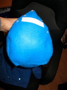 Turn the unit inside-out and fill with Poly-Fil. Hand-stitch the gap closed and attach to the hood using your best blind-stitch.