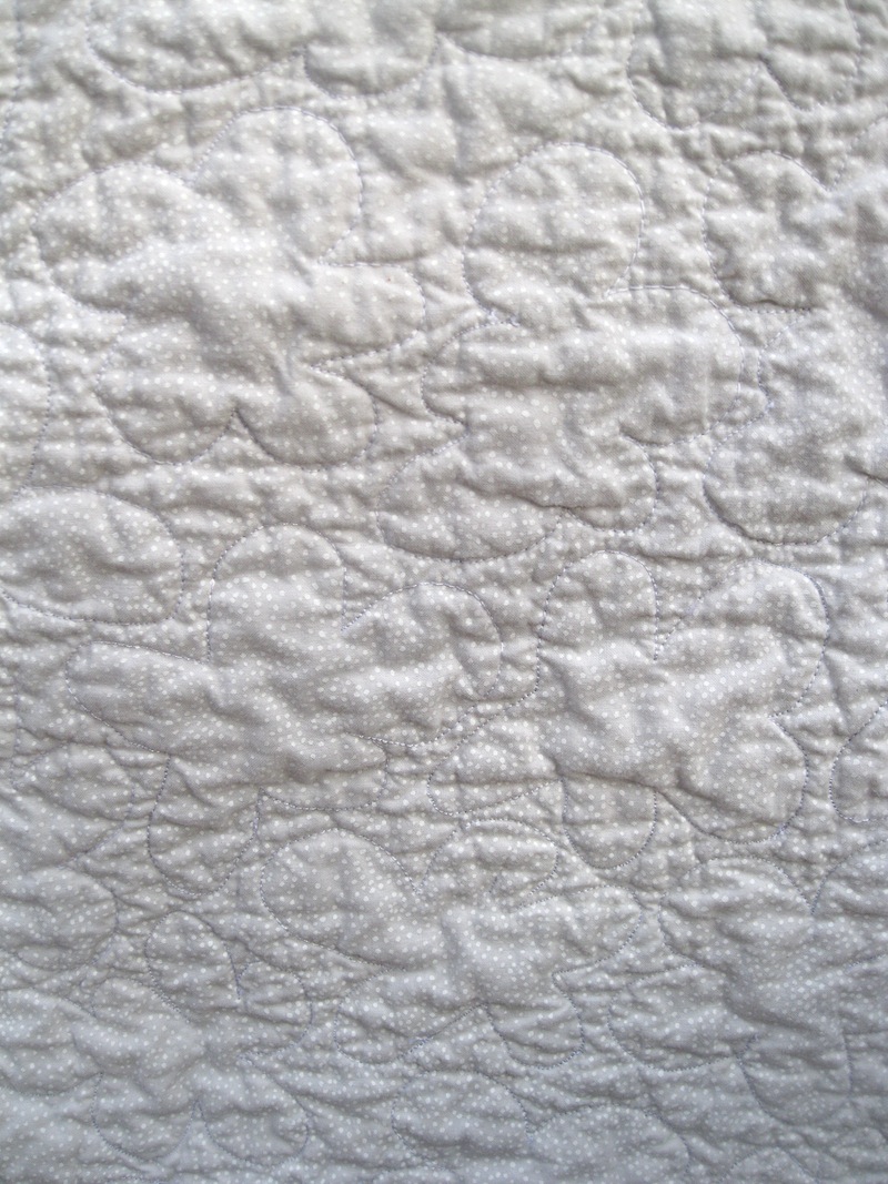 I picked a white-on-white print for the background, as I refuse to use solid white for a baby quilt.  At least this will somewhat camouflage spit-up stains. And I quilted little clouds (continuing on a theme from this project)!  White thread on top, invisible thread in the bobbin.