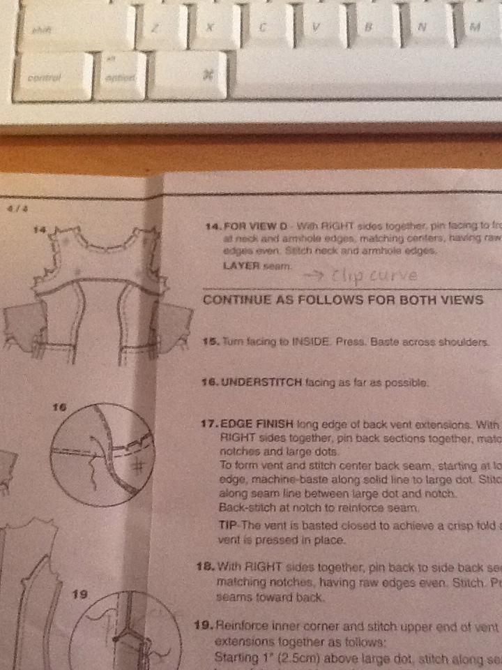 Step 14 – GRIEVANCE! You need to pin the facing to the front of the dress RIGHT SIDES TOGETHER. That’s what the words say here, but that it not how it looks in the picture. Right sides together, right sides together.