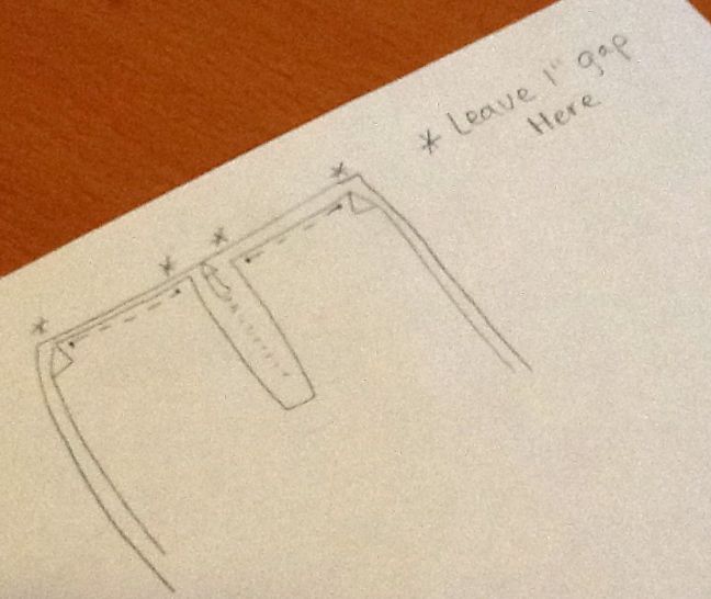 Sew the “Skirt Front” unit to the “Lining Front” unit along the waist line, right sides together, but leave a one inch gap from both edges: