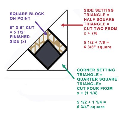 In my example, the Quarter Log Cabin blocks are cut to 6″, and are thus 5 1/2″ finished.   Use this formula for determining the size of your half square triangles:
