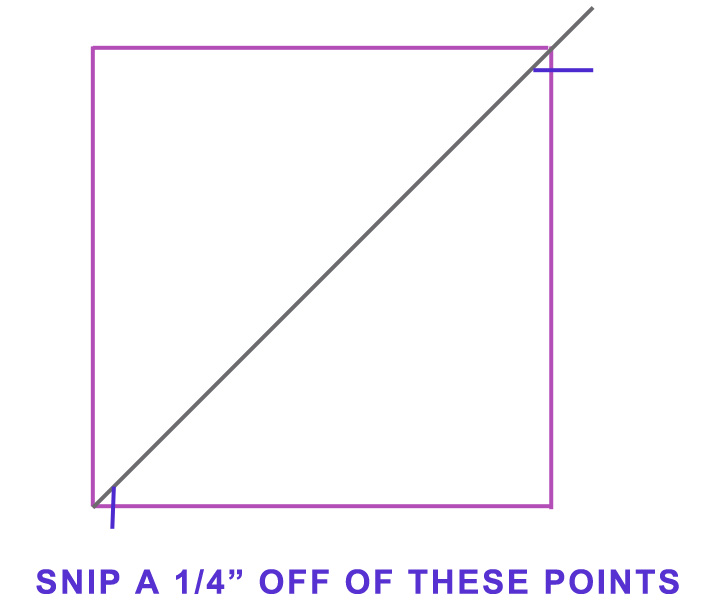 I snip the 1/4″ off so that my edges will line up pretty precisely with the Quarter Log Cabin blocks.