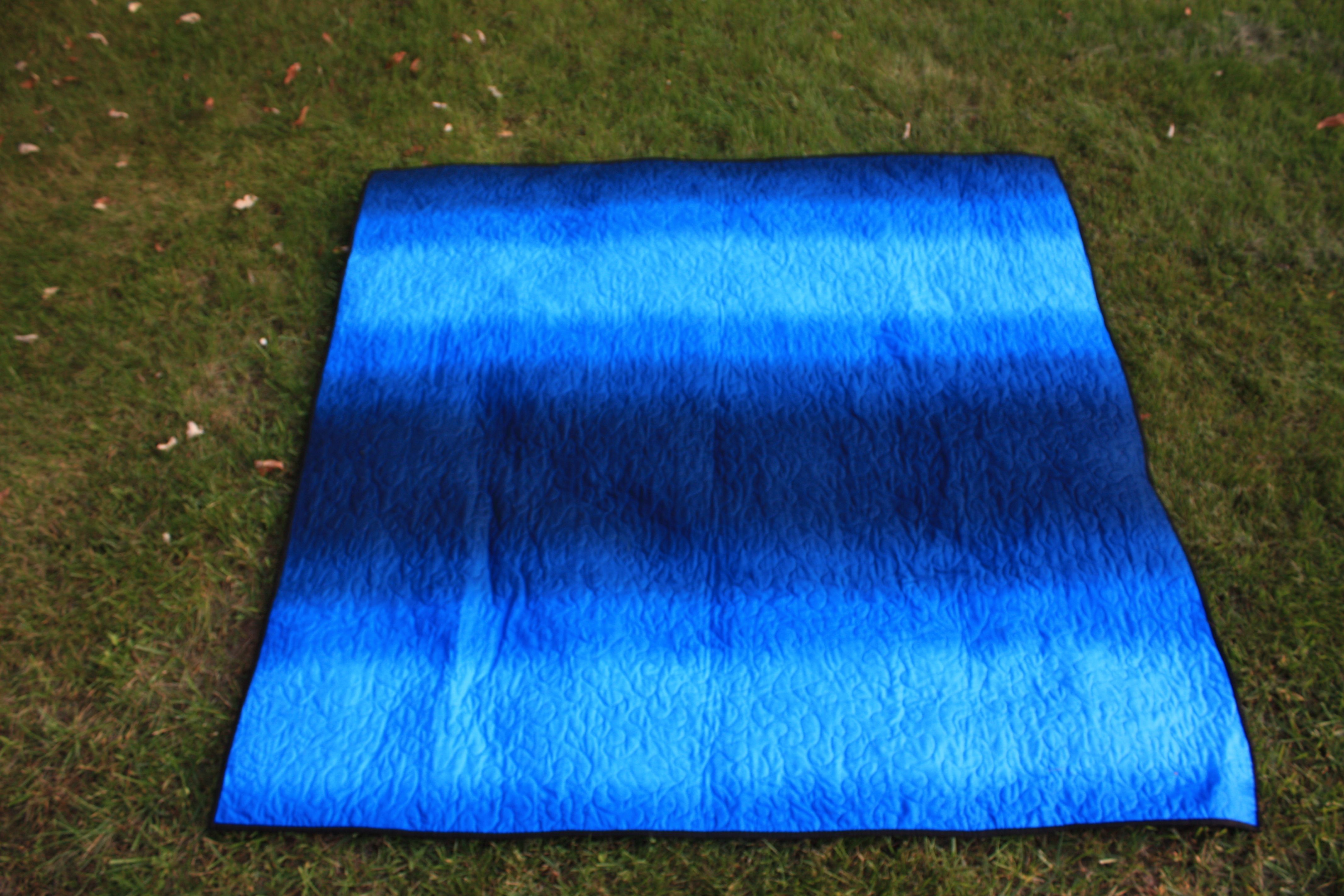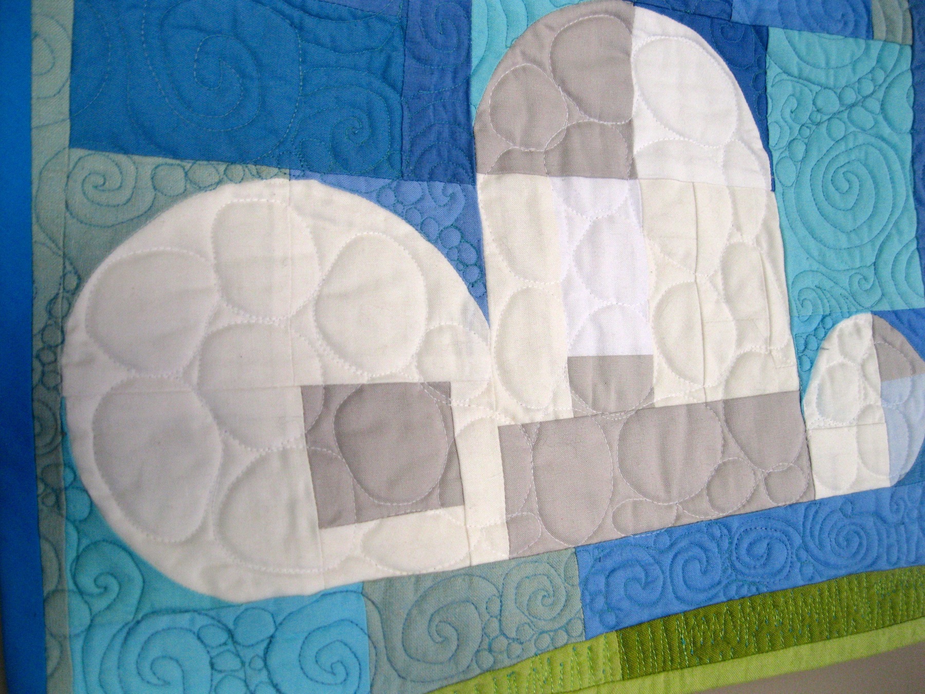 I quilted clouds in the sky and rolling fog for the bottom of the mountains. I added a little echo hand-quilting to the mountains in clear thread.