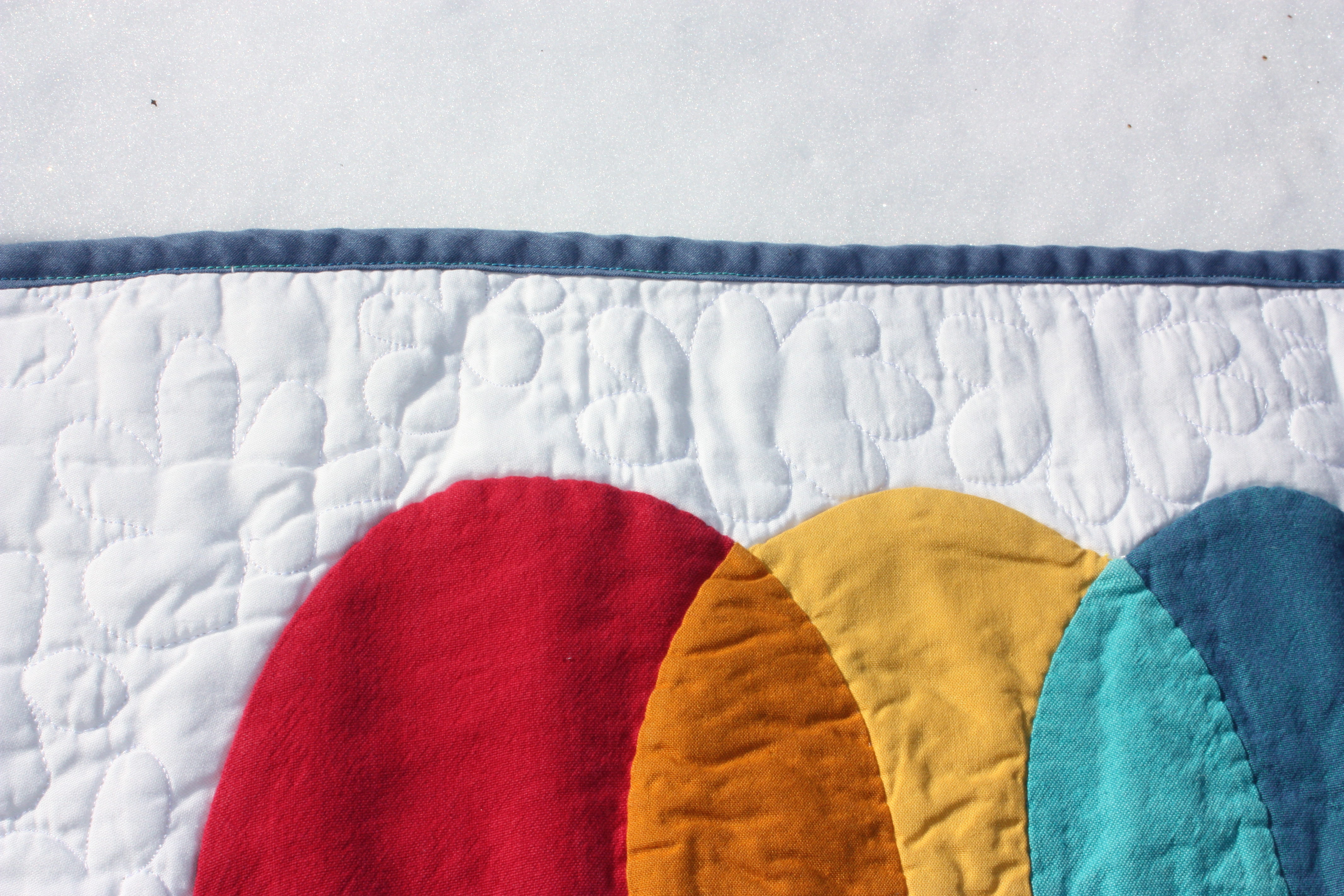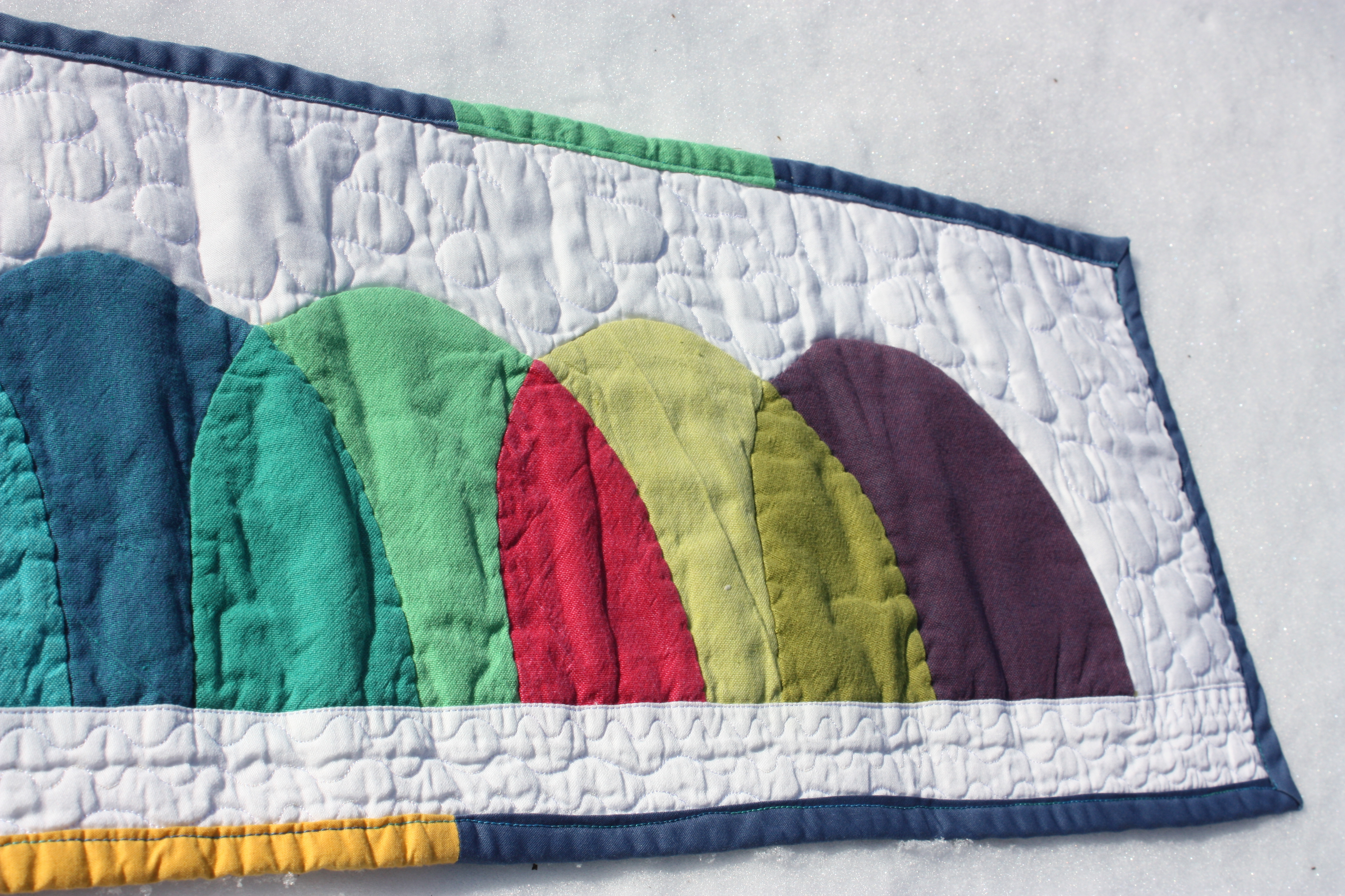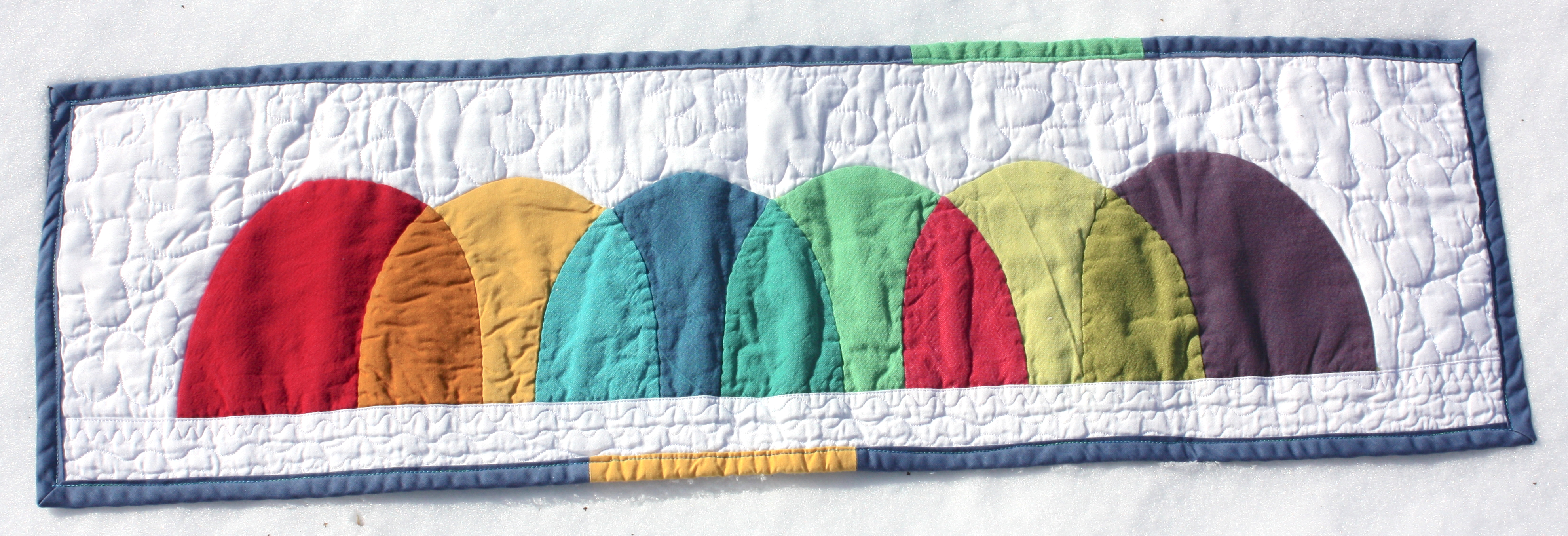 The color units are pieced together to make a single mountain-range unit, which was then hand appliqued to a white background. The bottom white strip was machine pieced.