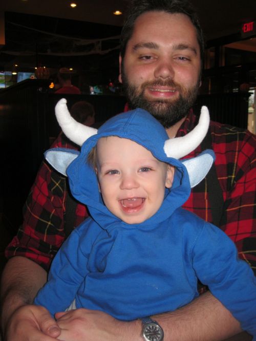 Hubby was a hunky Paul Bunyan. (He pulled this together all by his self)… With Son #2 being “Babe the Blue Ox” !  How cute is this?