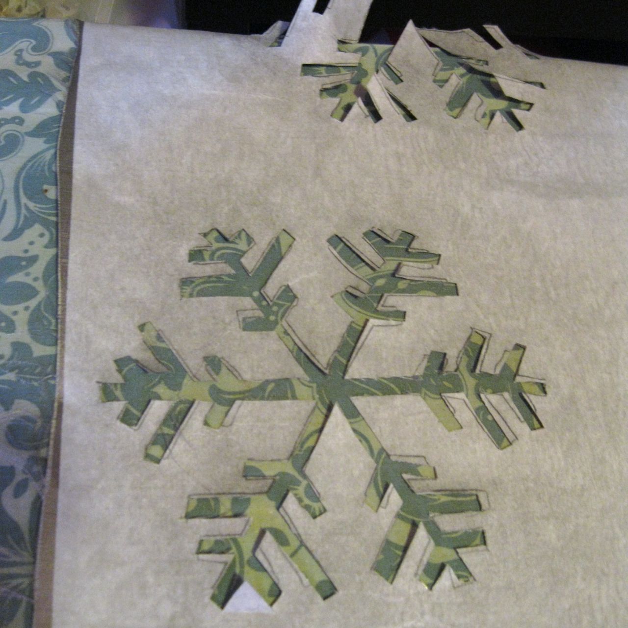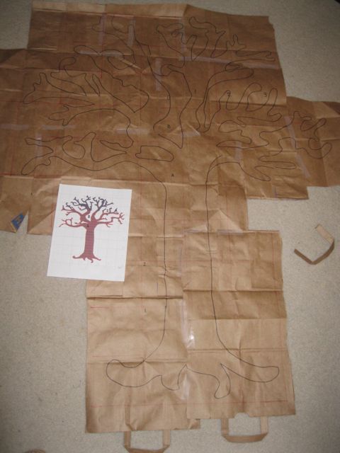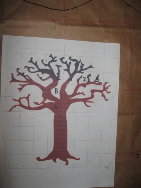 Ok so making the tree piece was a little tricky. I found a clip-art image of a spooky tree I liked, made a couple of alterations using photo-shopping software, and printed it out as large as I could. Then I drew a one inch grid on top of the image. I wanted my tree to be pretty big so I made a ratio of 1:5 and made each one inch square on my grid equal a 5 inch square on my gigantic pattern paper made out of taped together grocery bags. I think originally I had planned on doing a 1:6inch ratio (hence the numbers on my grid sheet below), but ended up thinking that’d be too big…