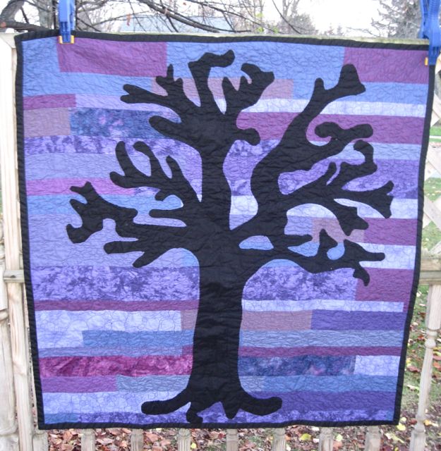 The tree is needle-turn appliqued onto a strip-pieced quilt.