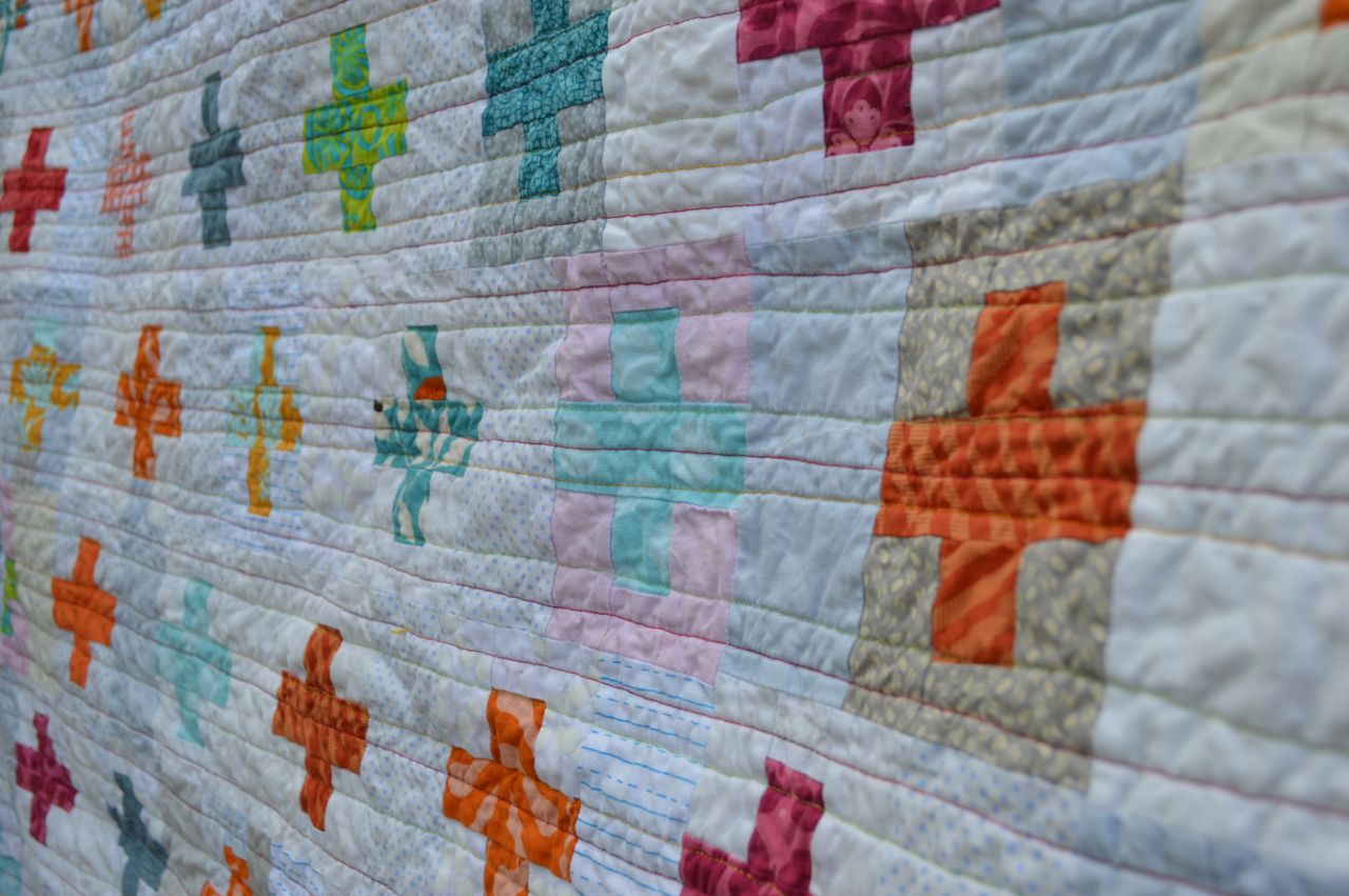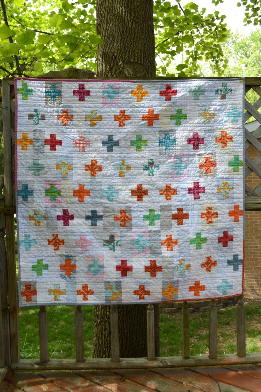 After seeing Debbie’s quilt and this one from Film in the Fridge, I decided to make this plus block blanket. Assorted greys, whites, and a bit of pink work for the background, and the pluses are primarily orange, teal, blue, or pink. I really love how this turned out!