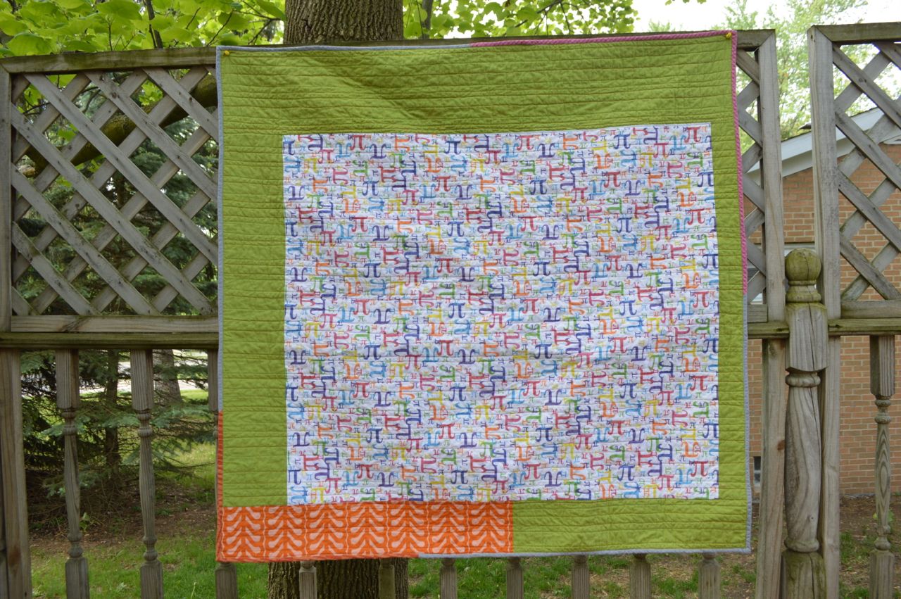 And for the back? My mother-in-law asked if I’d be able to find Pi symbol fabric for these engineers. Of course! I framed a yard of the Pi fabric with green and a splash of orange. The binding is a teensy bit scrappy, with grey and pink and orange.