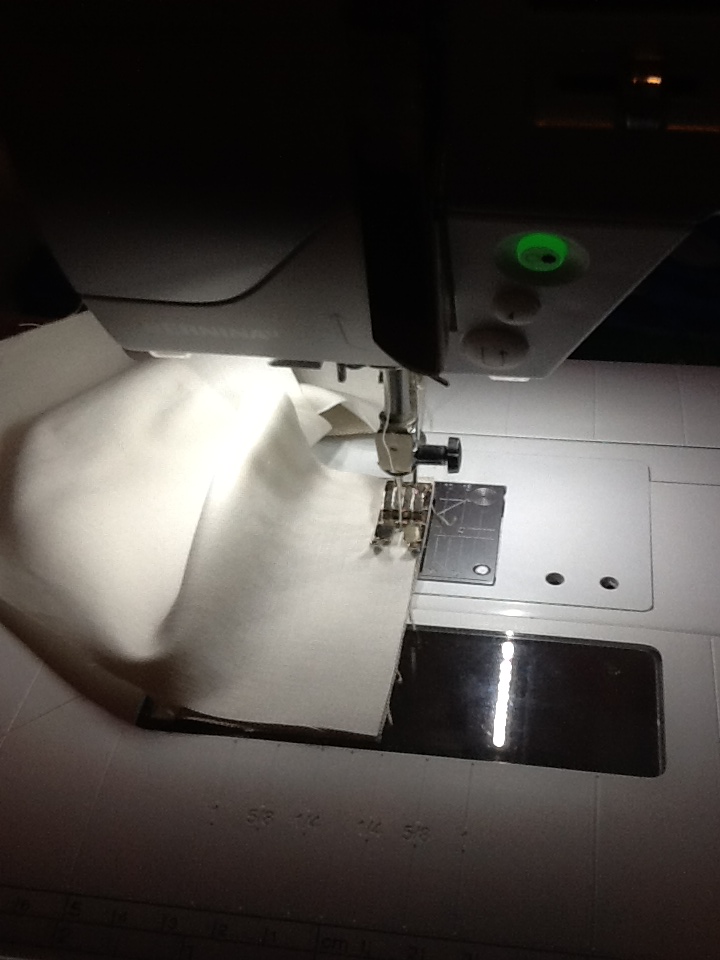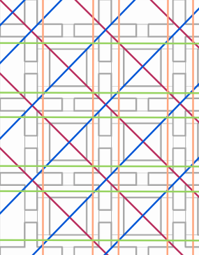 Looking at the above diagram, I first sewed the red diagonal lines. I rolled up my quilt (it’s a Queen-size) from opposite corners so that the middle of the quilt (on a diagonal) was what was left exposed. I like to start in the middle to tackle the most difficult part first. Once I get the absolute centers of the quilt done, I know that the bulk in the neck of my machine will just get smaller as I go. So I do my center “Red” line, and then head to the outside. I flip the quilt around and do the next center-most “Red” line and head out to the other side. Then I flip the quilt, re-roll, and do the same method for the “Blue” lines. Then I re-roll and do the “Green” lines, starting in the center and working to one side, then flipping it around and going from the center to the other side. I re-roll and do the “Orange” lines doing the same center-out process. Then I have a glass of wine!