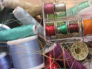 I have quilting threads, all-purpose threads, some weird rayons, and a couple of fun metallics. I would like to try elastic thread for some garment details, but I’m too wrapped up in the quilting world right now.