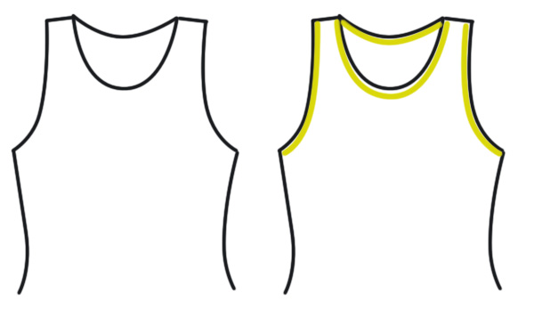 Now you just need to finish the armholes, neckhole, and bottom hem. Start by sticking a long strip of Wondertape along the neck-line’s raw edge, onto the wrong side of the garment. Remove the backing of the tape, and fold it down! It sticks! And now you can sew over the tape (on the right-side of the garment) with a narrow stretch stitch. It’s easy peasy sewing through the tape – no gunky needles in my experience. Repeat the process for the armholes and the hem. You could fold the edge over twice to encapsulate the raw edge completely. You could. I don’t.