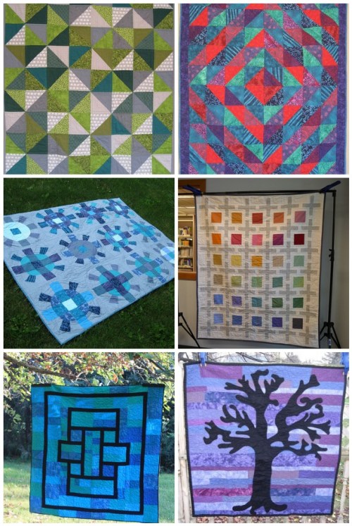 The tree is needle-turn appliqued onto a strip-pieced quilt.